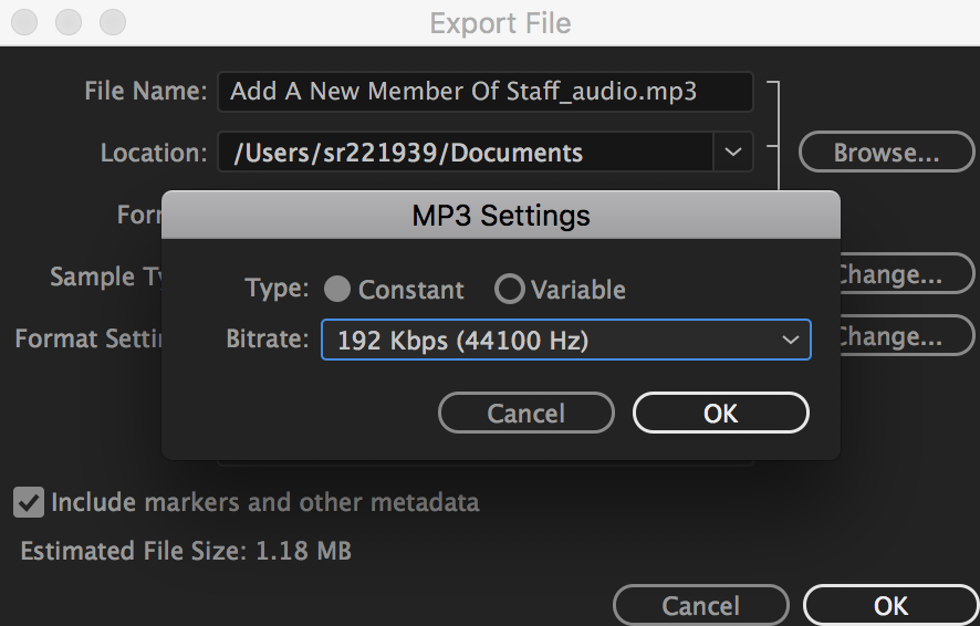 Similar to video files, audio files can end up becoming unnecessarily large. However as humans can't often easily tell the difference between high/low quality audio (especially if they are using poor hardware), files should be compressed. Please note that these tips are for students/staff submitting work in which the audio's functionality is more important than the quality.