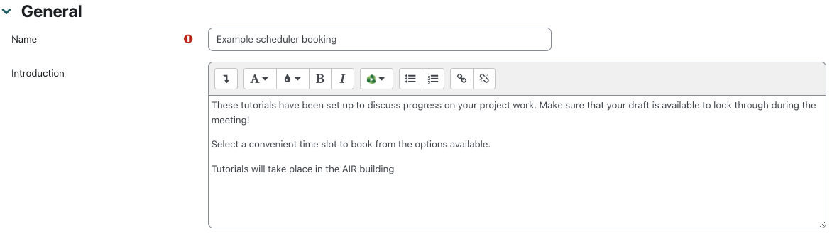 Enter a name for your scheduler and then add a description in the ‘Introduction text area. Text in the introduction field will be available for students to view after they click the activity to open it and should include information about the booking e.g., what the bookings are forwhere they will take place and details about what you would like individuals to bring along to the session.