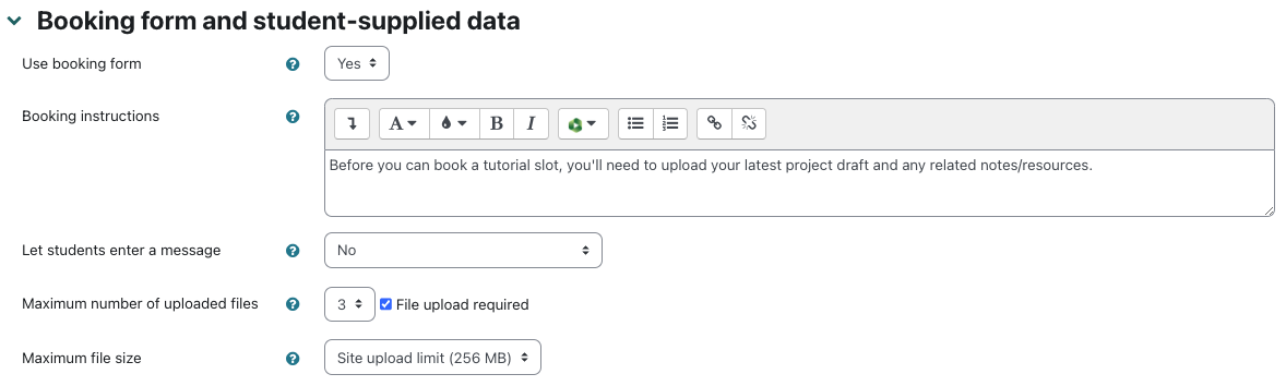You can use these settings to specify that certain rules must be met (for example a file submission or some text uploaded) in order to finalise the booking. A good example of this might be where the student is required to upload a draft of the work which will be discussed during the meeting. Note that this feature is disabled by default.