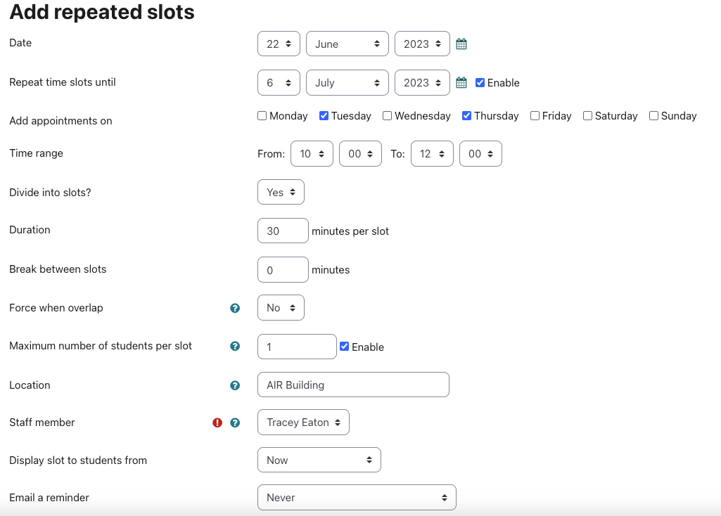 • Repeated time slots until - Enable repeated slots (if required) and select a date/time that slots will be repeated until.