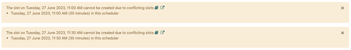 If such an error occurs, in order to add the slots successfully, you must either remove your slots in the other scheduler activity, or alternatively reschedule your new slots for a different time.