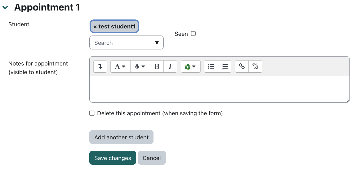 Note - If you set slots up to allow more than one student to book and wish to add another student to the time slot, click Add another student and select their name.