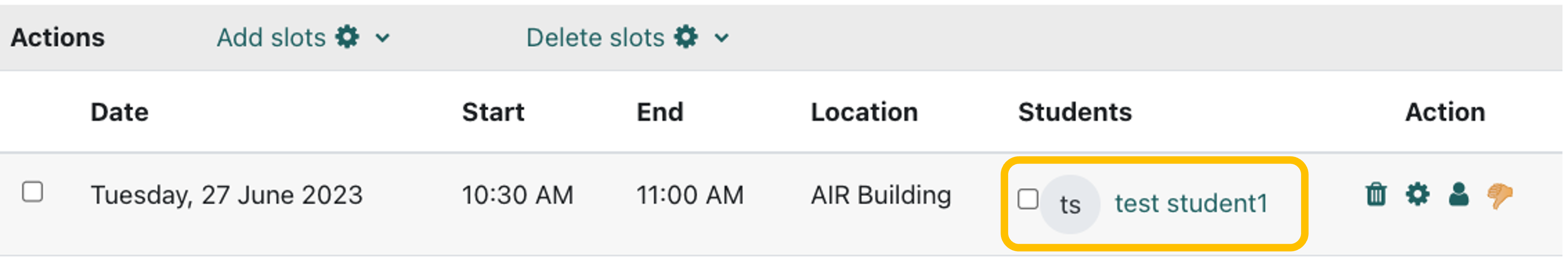 Next, find the slot you want to add the student, and click the 'cog' icon.