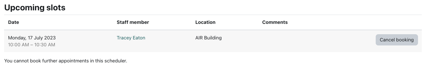 The booking request will appear in the 'Upcoming slots' area on screen. If you change your mind about the slots you can navigate back to the Scheduler Activity and click "Cancel booking".