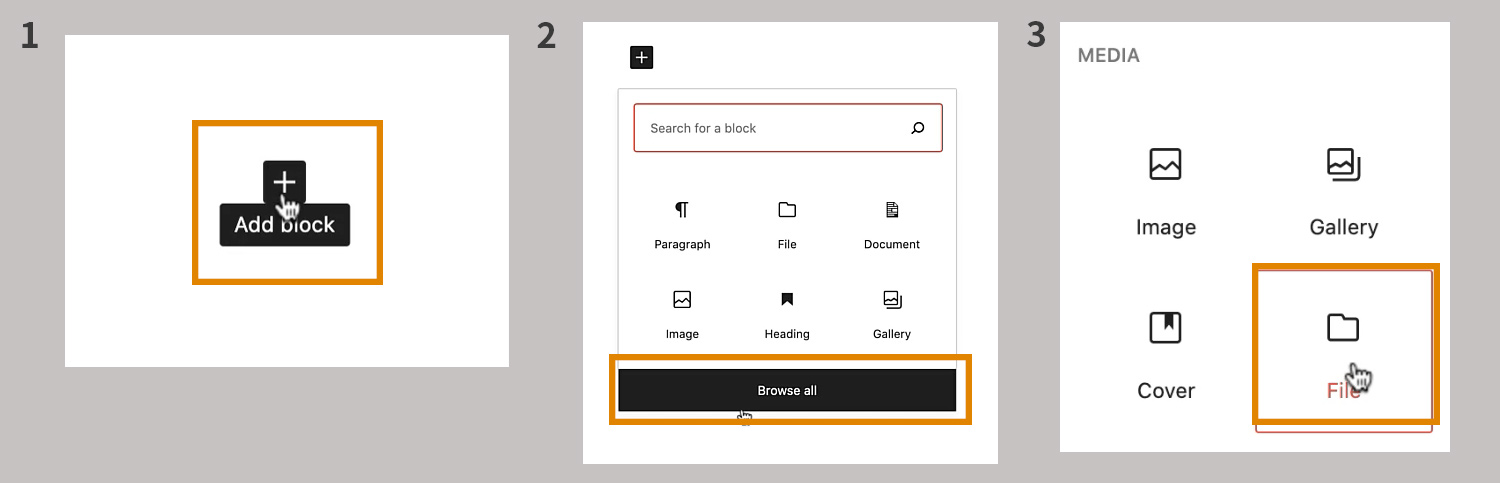 To upload a PDF to a post or a page first make sure you are logged in to Journal and on the correct site. Once you are on the post or page you want to edit click on the 'Add block' icon. Then click the 'Browse all' button. A menu of blocks will appear on the left hand side of the screen. Scroll down to the 'MEDIA' section and click on the 'File' icon.