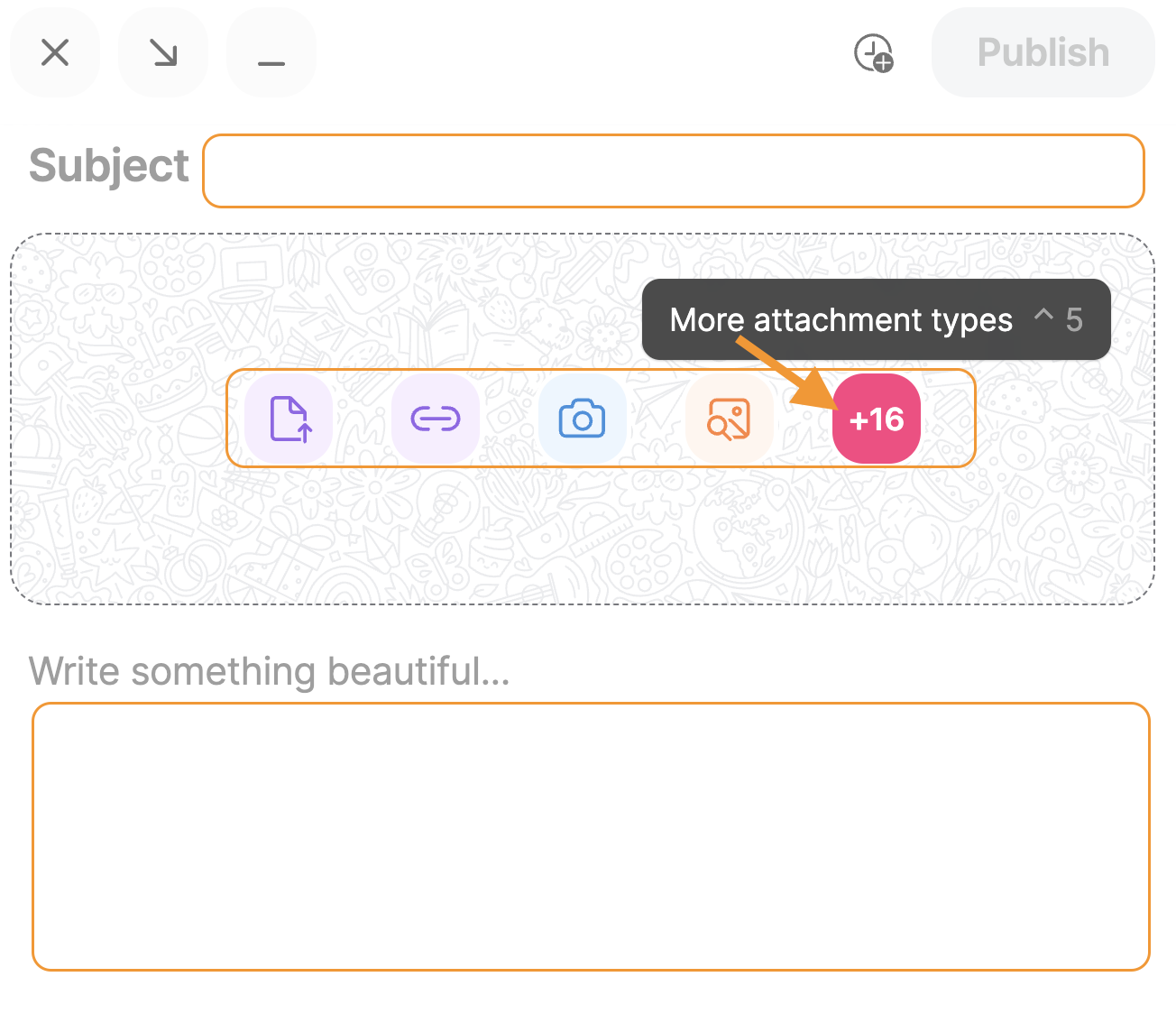 - Click on ‘More attachment types’ to add content such as gifs, YouTube videos or music from Spotify
