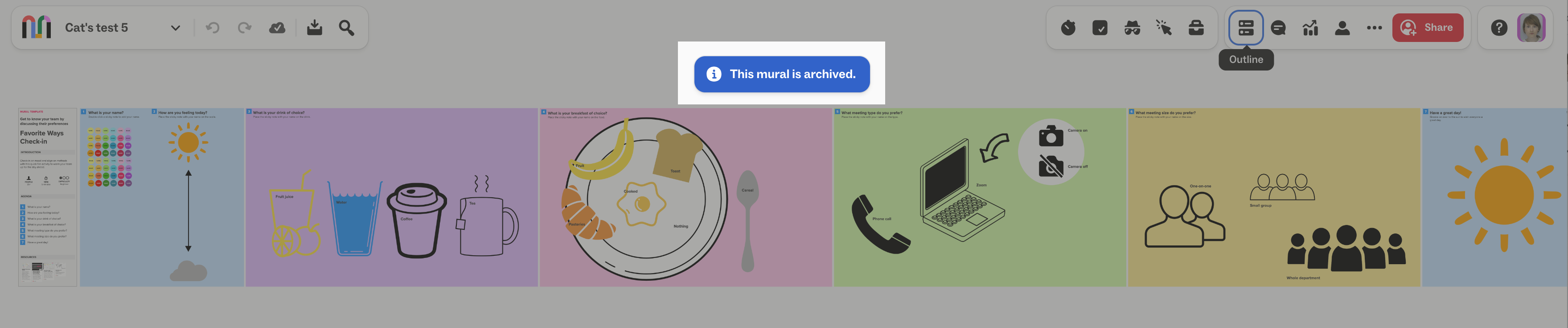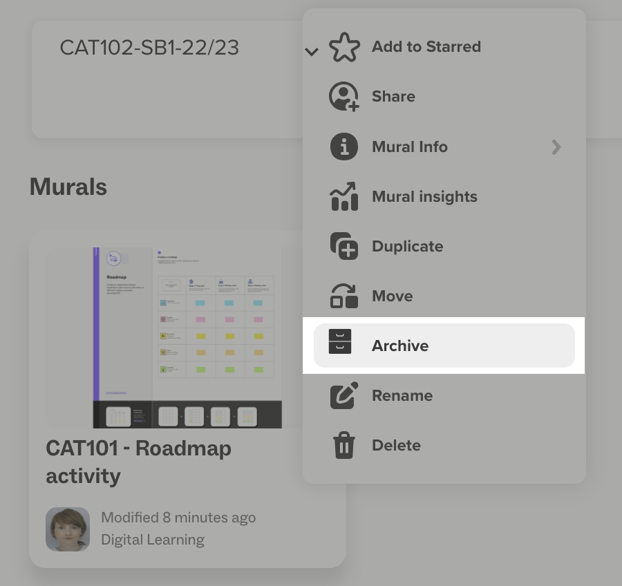 If you need to archive any murals but you are not the 'Mural Owner', first contact the listed owner or owners of the mural and they may be able to grant you ownership of the mural so you can proceed to archive. The Digital Learning team may also be able to assist you with this request.