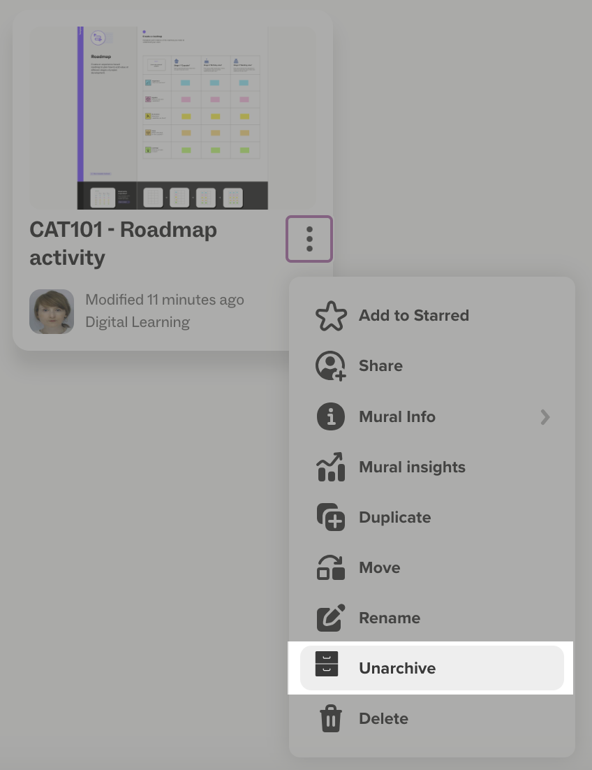 - On the mural you would like to unarchive, click on the three dots icon to the right of the mural’s thumbnail.