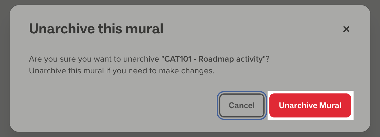- In the 'Unarchive this mural’ dialog window, click the ‘Unarchive Mural’ button.
